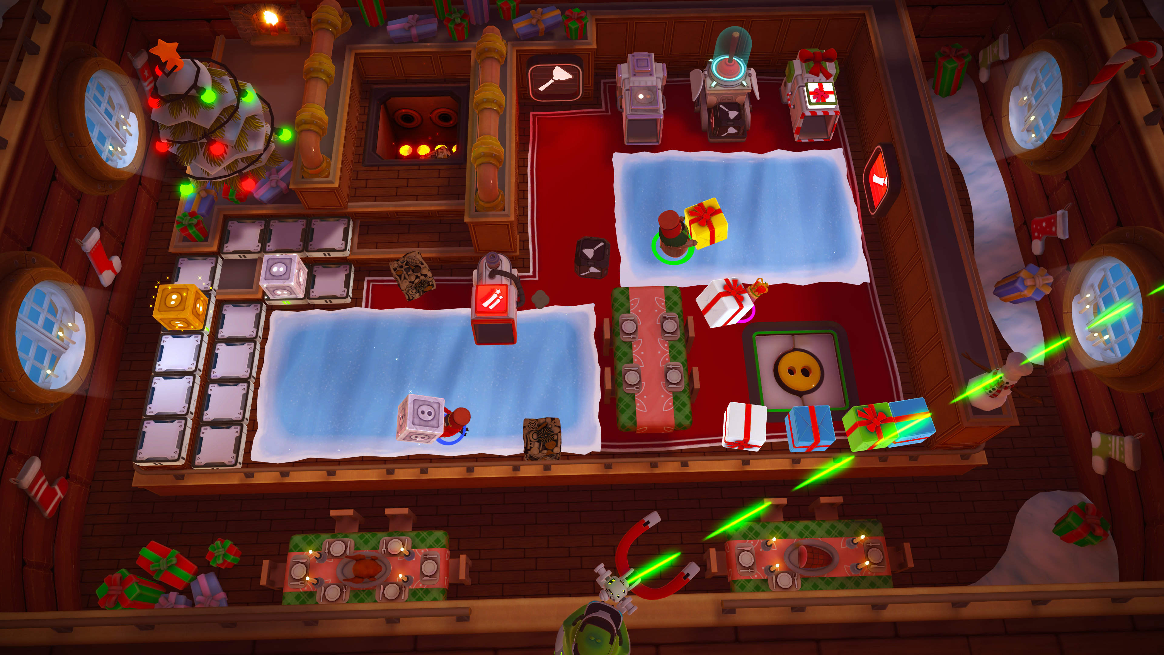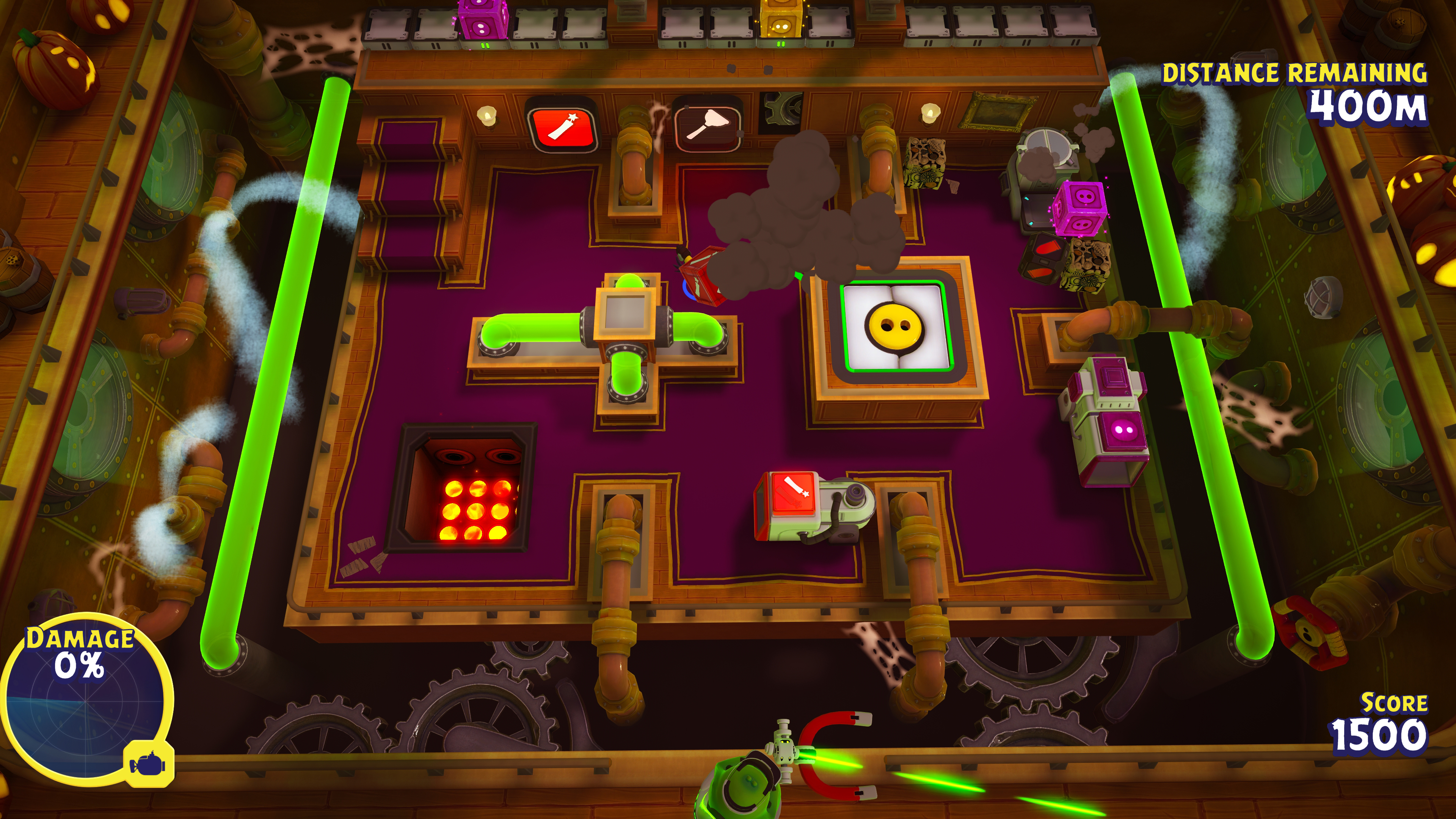 Each simple process—such as combining a green and blue block in a machine to craft Plunger ammunition and loading it in a launcher—becomes a complicated web of priority and time management, with players bickering and stepping on each other’s toes. Levels open like the calm before the storm, a sedate stream of treasure chests makes for an easy-to-maintain deck. Before long though, the deck is swamped with crates, Treasure, and explosives; the Captain is yelling for more ammunition, the Crew are scrambling to keep on top of their tasks, and the whole team comes Under Pressure.
